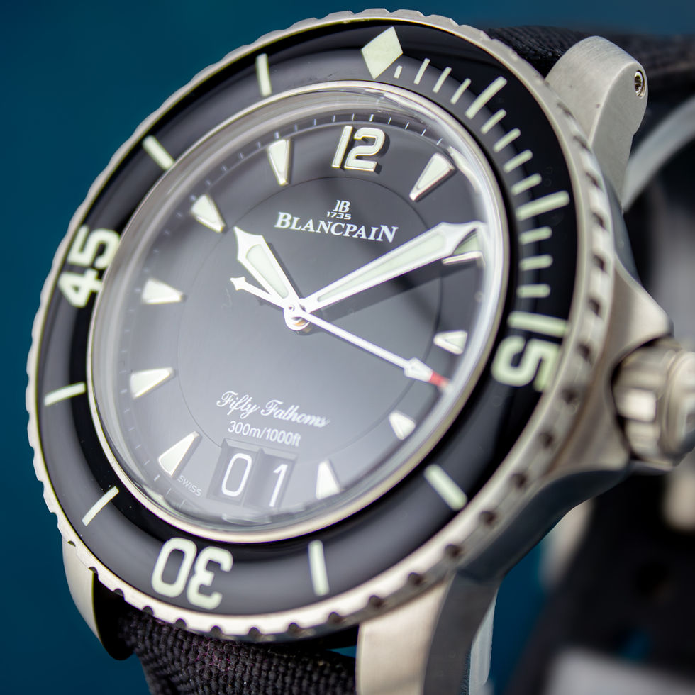 The bold 45mm titanium case houses a deep black dial with luminous Arabic numerals and a prominent large date display, ensuring instant readability both above and below the surface. With a 300-meter (30 ATM) water resistance, sapphire crystal, and unidirectional rotating bezel, this watch remains faithful to the Fifty Fathoms’ military diving heritage—while introducing contemporary technical sophistication.
