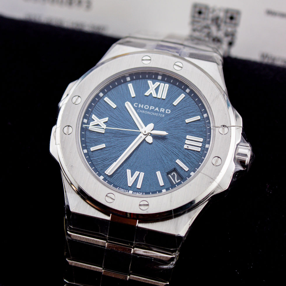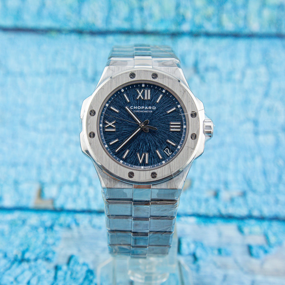 Crafted from brushed and polished stainless steel, the 41mm case features a sleek, ultra-wearable 9.7mm thickness, making it perfect for both daily wear and refined occasions. The watch showcases Chopard’s signature blue “Eagle Eye” dial, enhanced by luminous silver-tone hands, Roman numeral and stick hour markers, and a discreet date window positioned between 4 and 5 o’clock.
