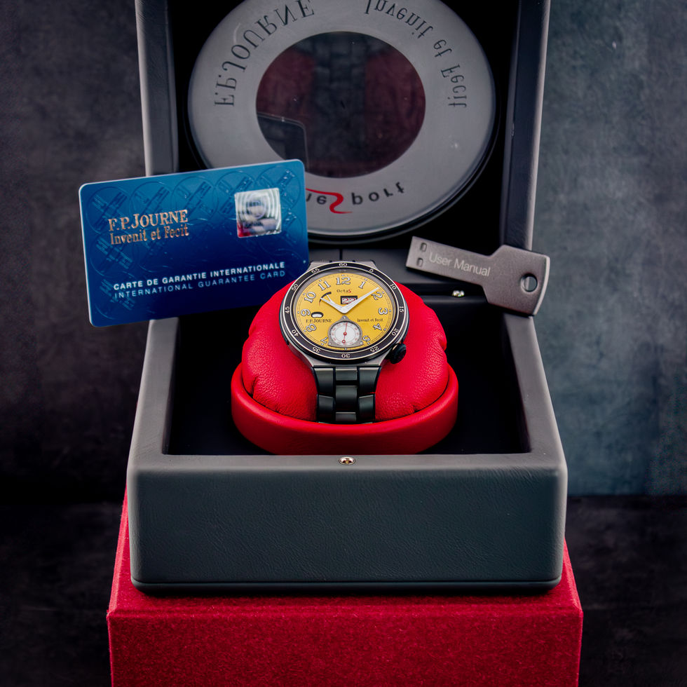 The 2018 F.P. Journe Linesport Octa Sport is a rare and striking timepiece that combines cutting-edge engineering with bold design. Its vibrant yellow aluminum dial immediately catches the eye, featuring a large date display, sub-seconds register, and power reserve indicator. Luminescent hands and numerals ensure excellent readability in any light.
