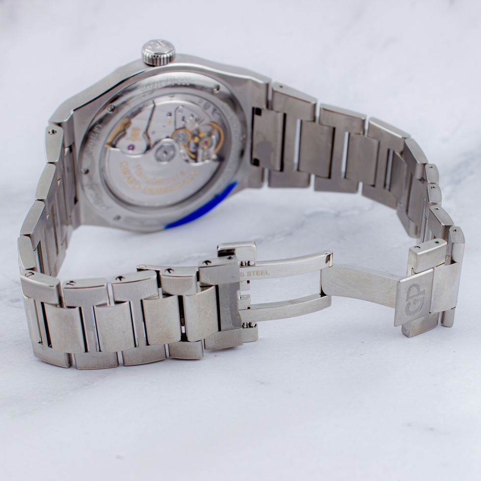 Powering the watch is the Girard-Perregaux in-house Caliber GP01800, a self-winding mechanical movement with a 54-hour power reserve, visible through the sapphire exhibition caseback. The integrated stainless steel bracelet is secured by a triple-folding clasp, providing comfort and security for daily wear.