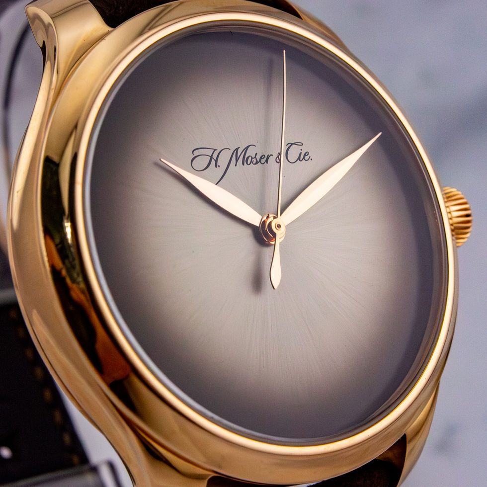 The H. Moser & Cie. Endeavour Centre Seconds 1200-0402 offers timeless sophistication with a 40mm rose gold case, grey fumé dial, and minimalist three-hand display, highlighting artisanal finishing.