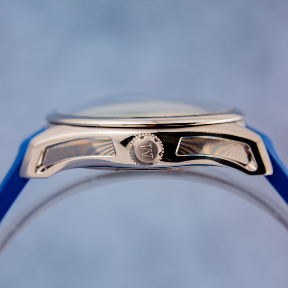 A screw-down crown engraved with the Moser “M” logo ensures impressive 120 meters of water resistance, making this watch suitable for everyday wear and active lifestyles. The case is paired with a blue perforated rubber strap secured by a stainless steel tang buckle.