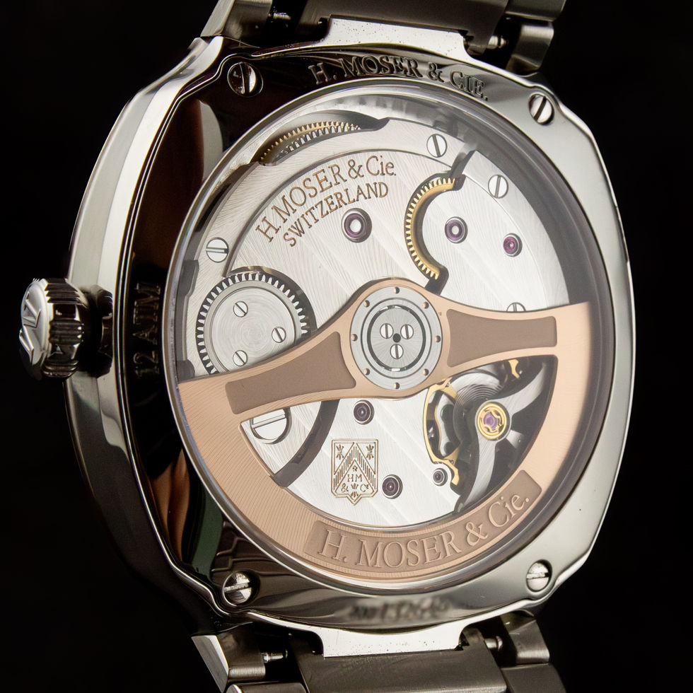 Inside the watch beats the automatic HMC 200 movement, designed and manufactured by H. Moser & Cie.