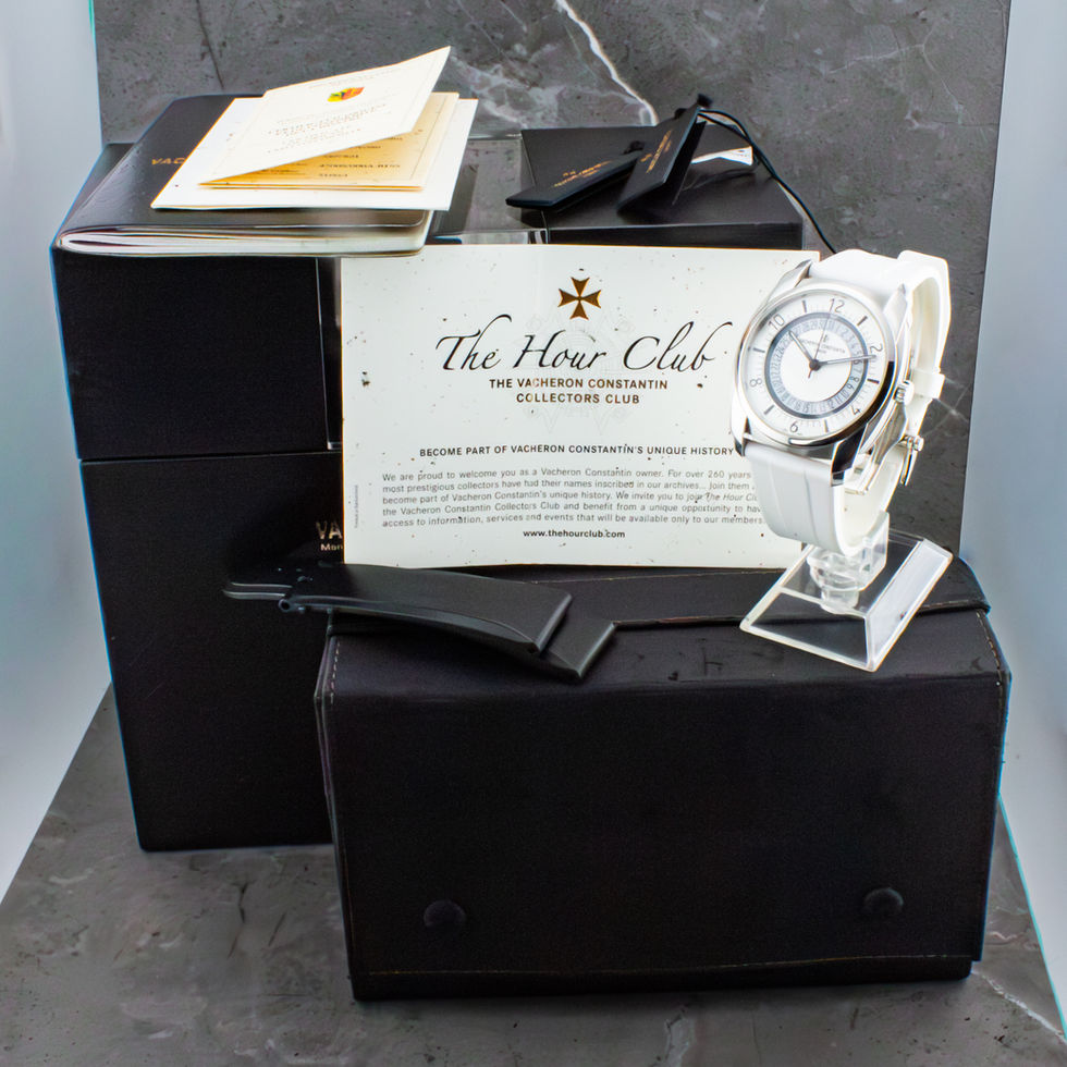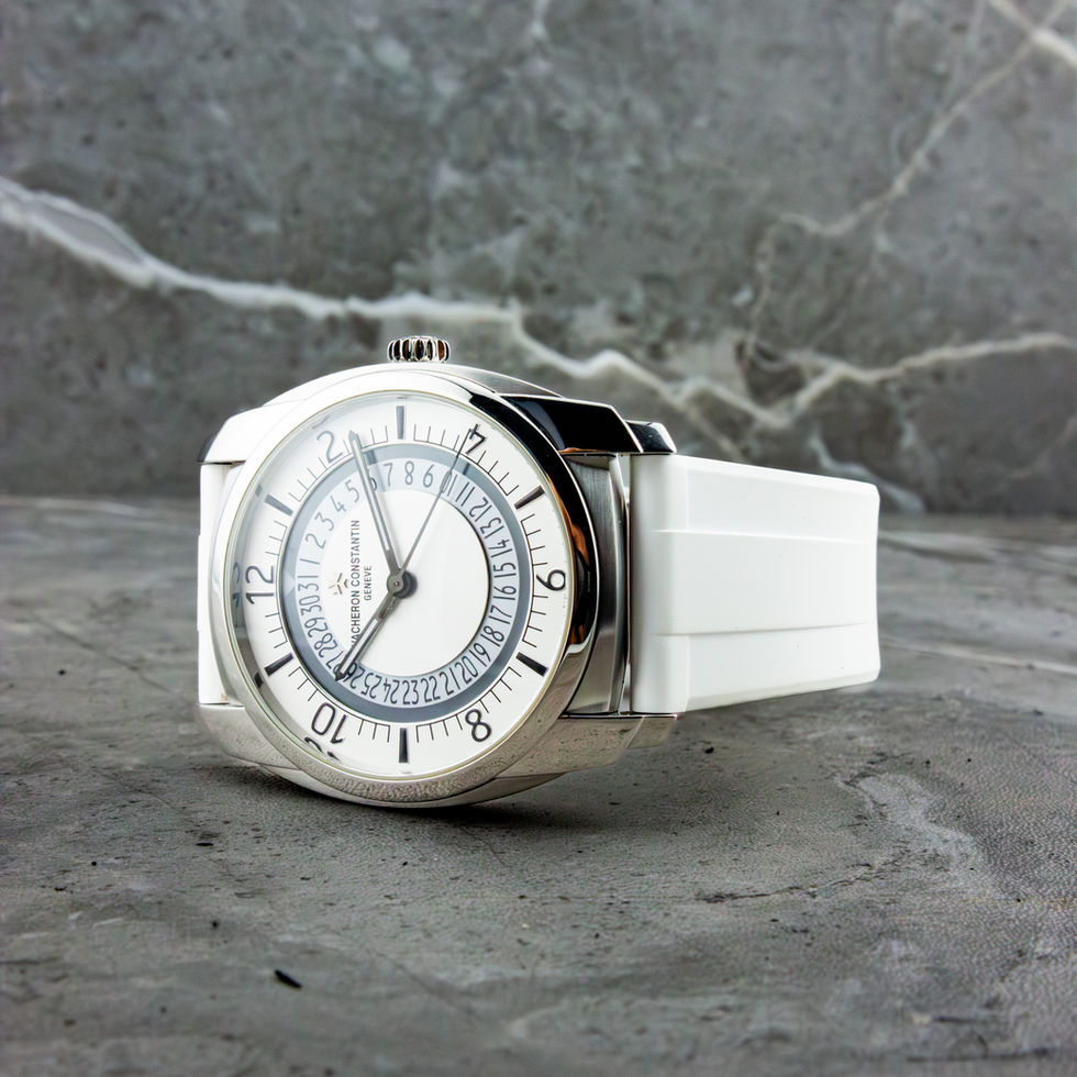 Elevate your collection with this stunning Vacheron Constantin Quai de L'Ile 4500S/000A-B195, a pre-owned masterpiece from 2018 that blends timeless Swiss craftsmanship with modern versatility. Featuring a sleek 41mm stainless steel case, silver-white dial with Arabic numerals, and dual rubber straps (white primary + extra black), this self-winding automatic watch delivers effortless luxury for daily wear or special occasions. Powered by the elite Caliber 5100/1 automatic movement with 60-hour power reserve and Geneva hallmark finish, it's a true horological gem—complete with box and papers.
